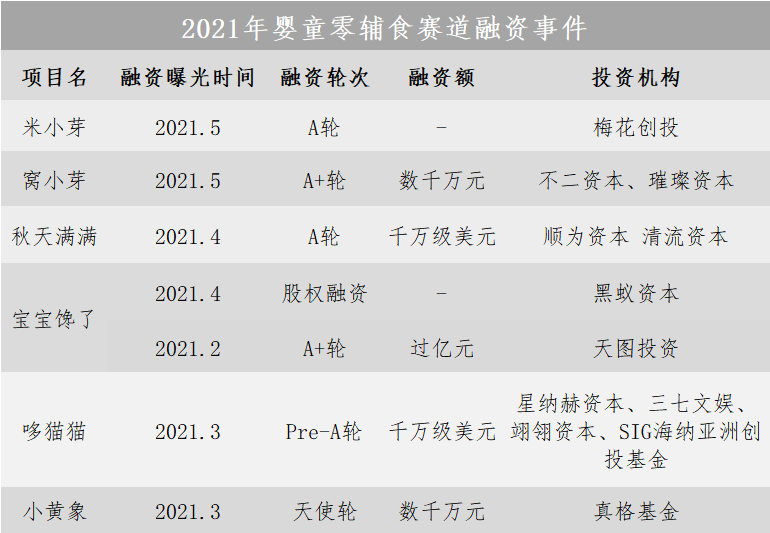 2021年春節過后的三個月的時間內,這個賽道至少已經發生了7起融資事件,真格、順為、梅花、天圖、黑蟻、清流等知名機構不斷押注,這個賽道就是嬰童零輔食